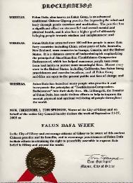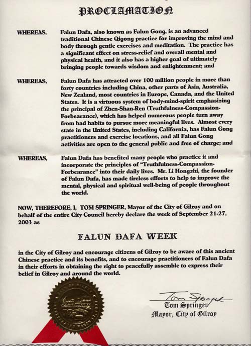 并鼓励吉尔罗伊市的民众关注这个古老的中国功法和他所带来的益处,并且鼓励法轮功学员在吉尔罗伊市和世界各地为争取和平集会以表达其信仰的权利所做出的努力。