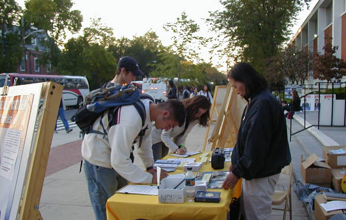 这是法轮功之友、国际大赦和法轮功学员第二次在该校园进行揭露江泽民集团对法轮功迫害的真相的活动。与上次相比,更多的美国青年学生明白了真相后表达了他们反对迫害,维护人权和信仰的心声。参与呼吁活动的学员体会到,青年学生观念少,正义感强,充满热情,所以在大学举行揭露江氏集团迫害法轮功的真相,呼吁青年学生加入反迫害的行列,对于推动让更多的人了解真相,反对迫害和为他们奠定美好未来的基础,具有重大的意义。