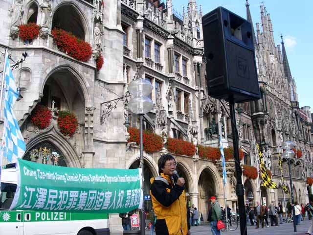 2003年10月6日,全球审江大联盟慕尼黑第一次集会在德国慕尼黑著名景点市中心的玛丽亚广场举行。各界人士自发参加正义大审判,江泽民的罪行使各界人士震惊,每当德文宣读江泽民的罪行时,就聚上来很多德国人。特别是中国旅游团听到了揭露江氏罪行的宣言和告人民书都停住了脚步,不由自主地走过来。几个中国人说:等一等,看看怎么公审江泽民!