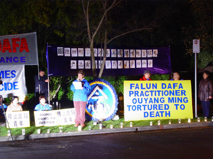 法轮功学员代表樊慧强在发言中说,欧阳明的哥哥欧阳昱就住在墨尔本。在他弟弟处于危险中时他曾多方奔走试图营救其弟,最终还是未能避免悲剧的发生。欧阳昱先生为此异常悲愤。目前,还有十多名澳洲公民的亲属现在仍因修炼法轮功被关押在中国的监狱中遭受洗脑和酷刑折磨。他们的家庭、亲属,不论在海内外,都同样地承受着精神上的打击,心灵上留下了难以愈合的创伤,物质经济上亦遭受到很大损失。