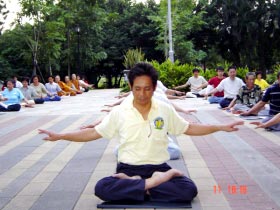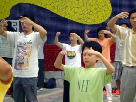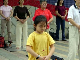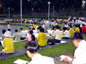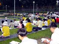 第二阶段:教唱学员创作之大法歌曲,大家正兴致勃勃,突然下了一阵大雨,很快的雨停了,继续我们的活动。优美的法轮功学员创作的歌曲音乐,深深地打动了民众们的心;最后在“法轮大法好”歌声中结束此次的活动。