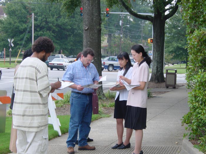 9月12日我们来到奥古斯塔(AUGUSTA)市中心的一个广场,举行新闻发布会。得到消息的WGAC电台早已经等候在那里。WGAC电台的记者采访了两位法轮功学员,详细地询问了很多问题。最后,记者在我们的征签表上签下他的名字。