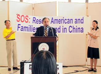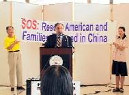 | 学员们在哥伦比亚市政厅前向人们介绍李祥春在中国遭受的虐待,并征集签名 | 格伦比亚市长在新闻发布会上讲话 |