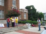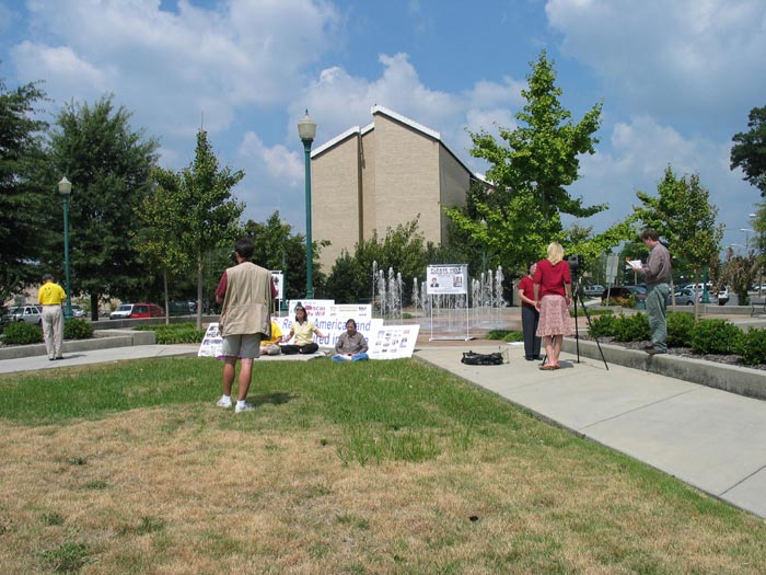 在市中心的公园,我们架起了展板。当地的报纸DAILY CITIZEN 和电视台WDNN采访了我们的新闻发布会。他们详细了解了美国公民李祥春在中国受迫害的情况。亚特兰大市法轮功学员吕朝晖先生向记者们讲述了他的妻子被关押在劳教所近3年以及遭受折磨的情况。
