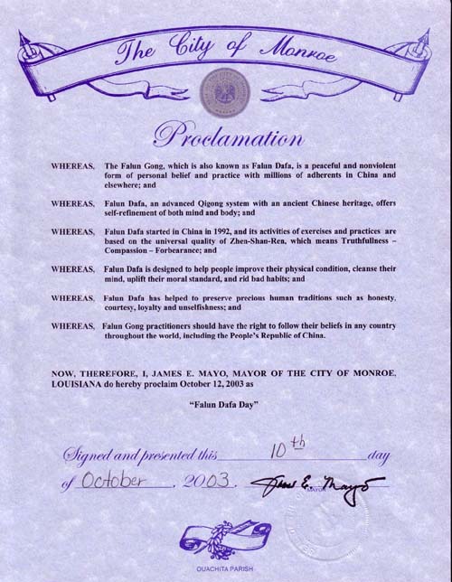 有鉴于此,我,詹姆斯-玛尤 (JAMES E. MAYO),路易斯安那州蒙罗(Monroe)市市长,特此宣布2003年10月12日为