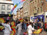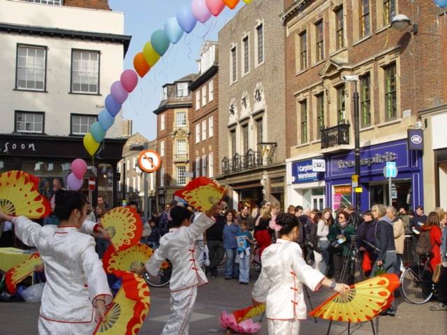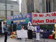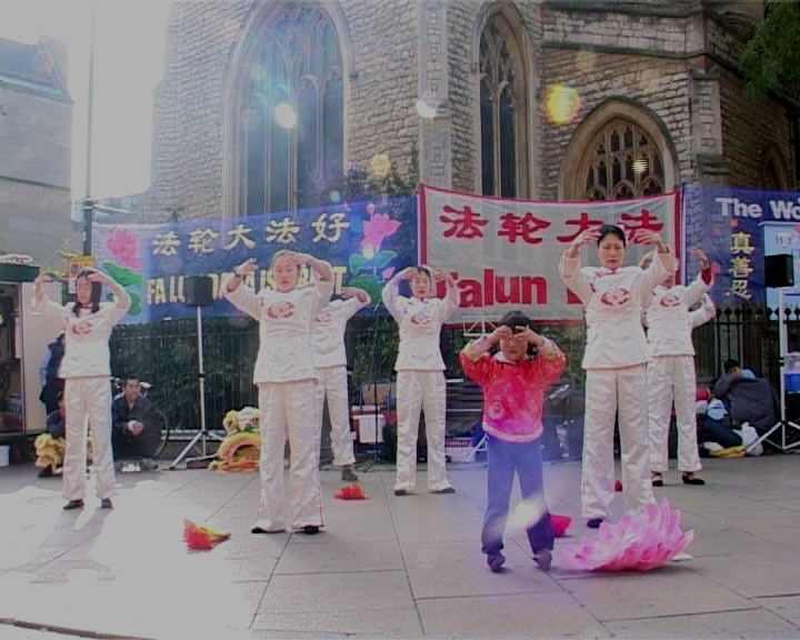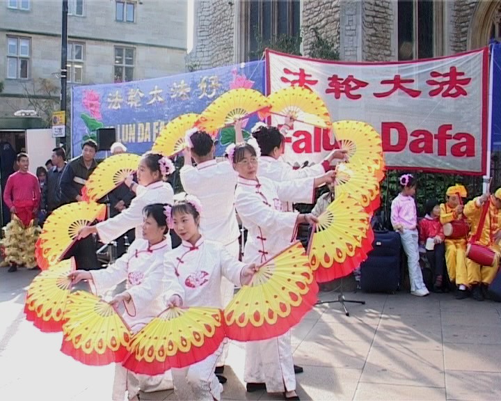 在这次庆典活动中,除了法轮功功法表演,舞狮,扇子舞,笛子独奏等传统节目外,一出揭露江泽民集团迫害法轮功学员的审江短剧激起了众多东西方观众的浓厚兴趣。妹妹曾因炼功而被非法劳教和酷刑折磨的英国居民梁女士及未婚妻至今还被拘押的谢卫国博士作为现场证人加入了本剧的演出。在全球公审江泽民的海报展板前始终都有一些中国人或西方人认真阅读了解列举的江氏集团所犯下的灭绝人性的滔天罪行及全球各地对江泽民的起诉介绍。一位上海来的老人带着小孙女也兴致勃勃地观看了我们的演出,他期盼对江泽民的国际审判就像公审南斯拉夫前独裁者米洛舍维奇一样能最终实现,对作恶者逃不脱现世的惩罚他感到很开心。一位在剑桥工作的日本医生对像法轮功这样传统的东方文化都被迫害深感不平。他意识到让更多人了解事实真象就是在帮助学员。