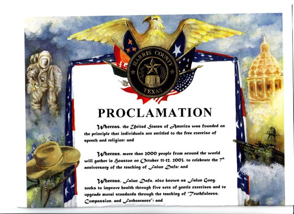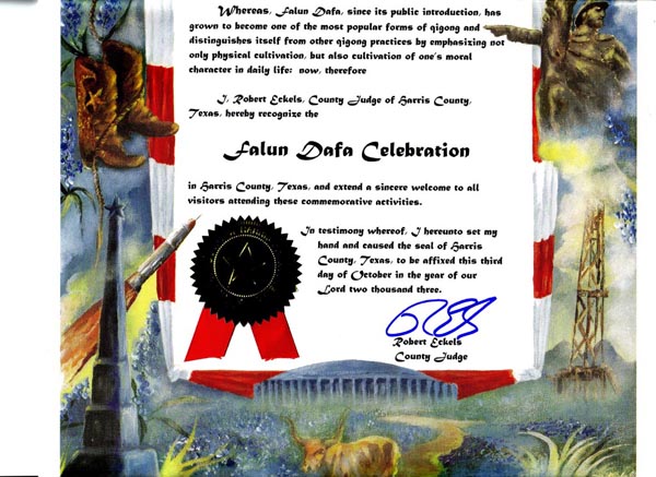 鉴此,我,罗伯特-艾克斯(Robert Eckels),哈里斯(Harris)郡法官,表彰法轮大法的庆祝。并对来自世界各地参加庆祝活动的人们表示欢迎。
