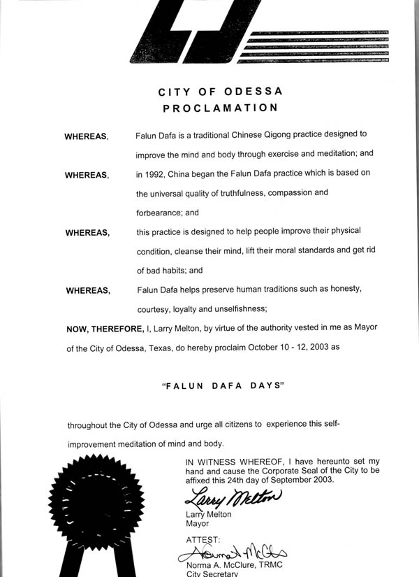 美国德州众议员格伦-路易斯宣布2003年10月12日为德州“李洪志日”暨“法轮大法日”,并致德州法会及与其相关的一系列意义深远的活动以最美好的祝愿。