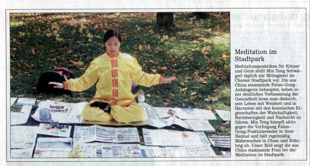 Min Teng-Schwägerl向大家介绍一种修炼身心的功法。她每天中午在卡姆城市公园炼功。这位来自中国的法轮功修炼者称,修炼使人们的健康状态有明显改善,更让人们的生活拥有智慧与以真,善,忍营造的和谐。Min Teng积极抗议在她的故乡对法轮功修炼者的迫害,并定期在卡姆和魁茨汀市举办请愿活动。我们的照片向大家展示这位来自中国的女士在城市公园修炼的功法。