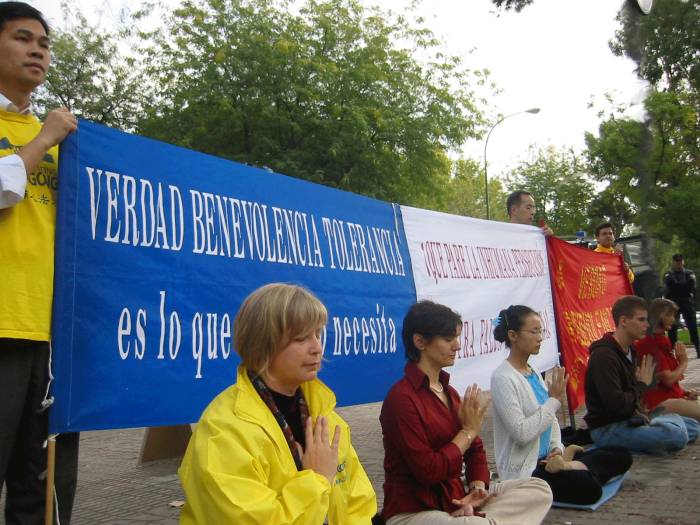 在凉爽的略带一丝寒意的秋风中,我们展开了写有西班牙文“请帮助我们共同制止中国政府对法轮功学员的虐杀”、“真、善、忍”等字样的横幅。红黄蓝相间的横幅十分醒目,立即吸引了众多过往行人和司机的目光。而停在我们旁边的大警车以及警察也使人们意识到这里有重要的事情在发生……