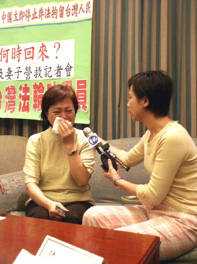 | 林晓凯的父母及新婚妻子(右起三人)召开记者会,呼吁中共早日让全家团圆。 | 林母在接受媒体访问时悲从中来,频频拭泪。 |