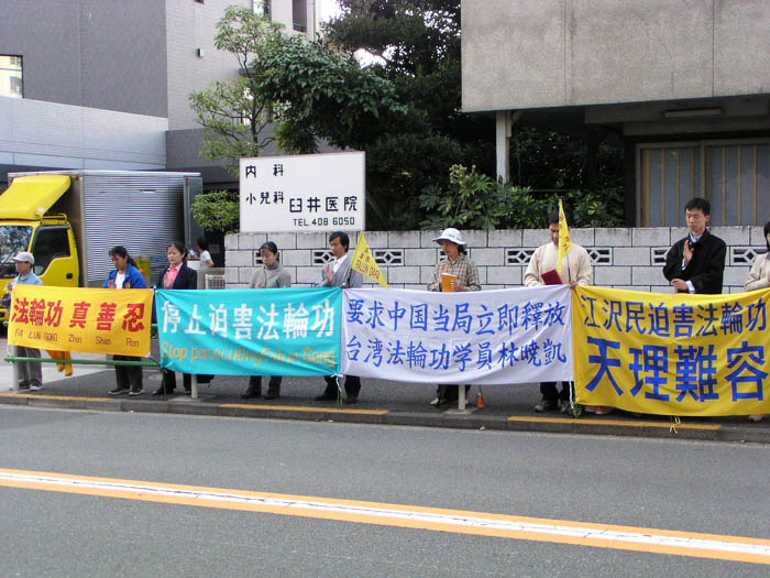 。10月26日这一天,我们再次来到中国大使馆,要求中国政府停止迫害法轮功,立刻释放日本的金子容子、台湾的林晓凯、美国的李祥春等在中国被关押的法轮功学员。