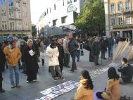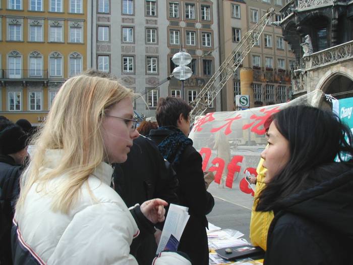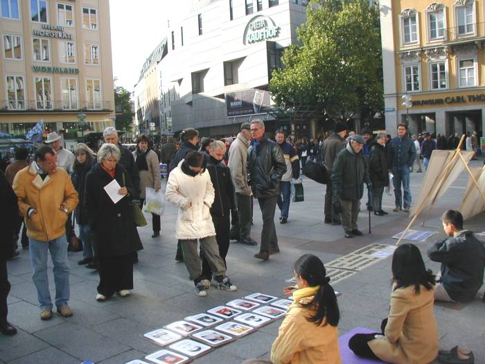 许多从大陆来欧洲旅游的中国人看到大法弟子的炼功场景,看到了江氏的暴政,有的久久地徘徊在大法洪传世界和江氏集团残酷迫害法轮功学员的图片前,不肯离去。有的人十分吃惊,因为他们看到的、听到的和国内宣传的完全不一样。有一位女士最初不敢拿资料,过了一会儿,她又兜回来找到刚才要给她资料的学员索要资料。