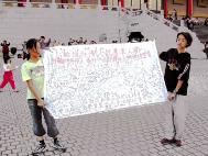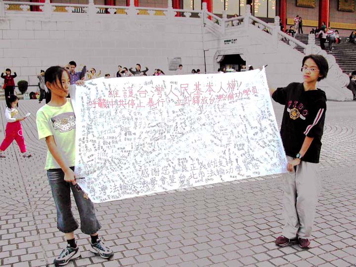 假日中正纪念堂游客众多,很多民众都已经从报纸或电视新闻得知林晓凯被非法拘押的事件,都认为中共非法拘押台湾法轮功学员已经严重侵犯到台湾人民基本人权,马上签名支持。不知道这个事件的民众,经由学员的说明也都明白了,立刻拿起笔签下了名字。