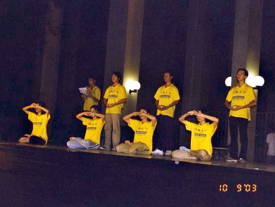 【明慧网2003年10月3日】每年台湾中央大学都会举办社团联展以欢迎新生,法轮功社参与了摆摊和舞台表演,希望让更多人对大法有正面印象。我们发的传单正面为法轮功社团简介,背面为控江案近况,藉这个机会。