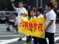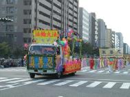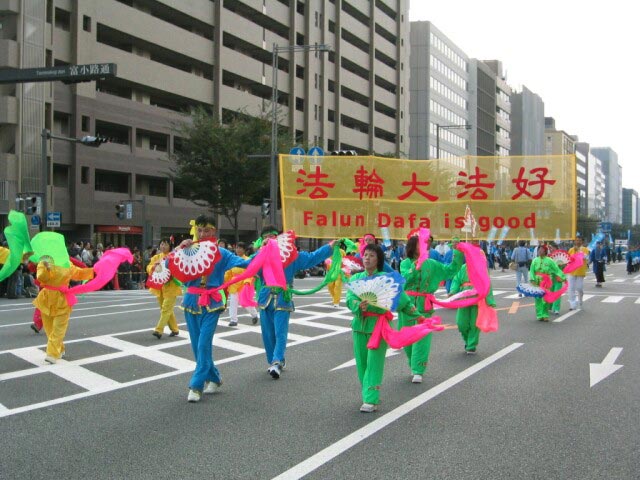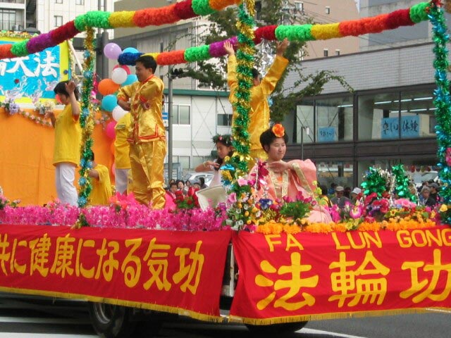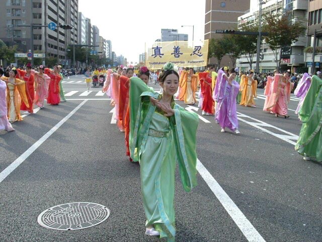 下午两点多游行开始,法轮功队伍排在第37位出场。当我们的队伍一亮相,立刻引起了观众的注意。特别是“普度”音乐一响起,更是抓住了观众的心,喧闹的街道一片寂静。花车上的“法轮大法”“真善忍”的展板引人注目,天女散花队让人心旷神怡,活泼欢快的秧歌队让人们振奋,唐装队典雅华贵,轻柔舒缓的舞蹈和学员们祥和沉静的气质使人们仿佛进入仙境。游行会场的广播里简要向观众介绍着法轮功的情况。在唐装队伍翩翩起舞时,播音员还充满激情地说,“京都市民恐怕是第一次看到这样美丽的服装和表演,让我们以热烈的掌声欢迎他们。”学员们在表演时街道两旁不时有掌声响起,观众们不住地赞叹“真美呀”“太好了”,表演结束退场时,人们还不住地和我们挥手,有的拉着穿唐装的女学员合影留念。
