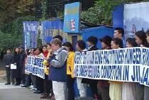 洛杉矶法轮功学员10月28日晚在中领馆前集会,表达对目前关押在吉林监狱内的100多名正在绝食的法轮功学员的声援和关注。为抗议残酷迫害,监狱中的法轮功学员已绝食多日,长春学员刘成军三日前便处于生命垂危状态。刘成军2002年3月5日被当局以长春有线电视网插播法轮功真象节目事件为名非法抓捕,被判刑19年,屡遭毒打、体罚等各种迫害。