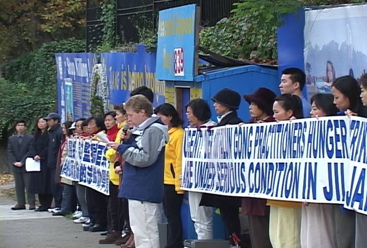 10月28日晚,美国休士顿法轮功学员来到中领馆前声援在绝食中的吉林同修,强烈要求中国释放吉林监狱内所有被关押的法轮功学员,给予刘成军人道主义的救援。吉林长春法轮功学员刘成军为了让人们了解法轮功真相,突破中国新闻严密封锁,插播法轮功真象节目,却因此而被捕。为了抗议狱方的迫害,目前有100多名法轮功学员在吉林监狱内绝食。