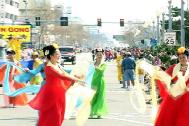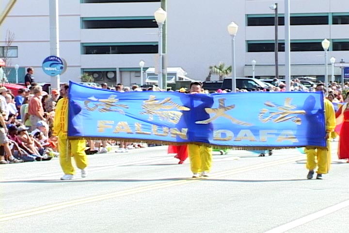 法轮功的游行队伍由舞蹈和花车组成。对于了解东方文化甚少的美国人来说,仙女舞蹈无疑是一道靓丽的风景线。绚丽、优美的舞姿在众多游行队伍中显得特别与众不同: “太美了”, “太好了”,游行所到之处,掌声、叫好声不断。唐装舞后面的花车也颇为引人注目。学员在花车上面的功法表演,宁静、庄重,让人们感到了法轮功带来的祥和美好。观众兴趣浓厚,纷纷向学员索要资料。当得知法轮功学员在十月份将举办免费教功班时,许多当地居民非常高兴,表示届时会参加。