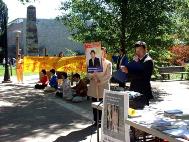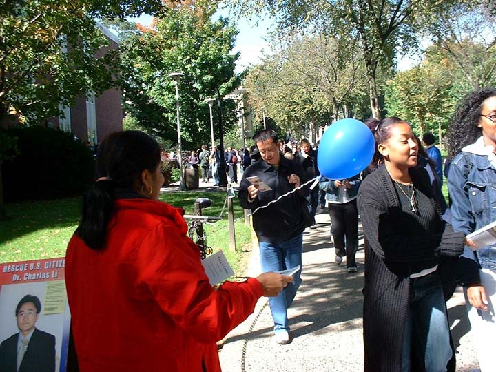 中午的校园,“法轮大法”、“世界需要真善忍”等大型横幅和数十名法轮功学员宁静和谐的炼功场面,吸引着来来往往的学生纷纷伫足接过法轮功真相材料、观看营救美国公民李祥春医生的展板、为呼吁释放李祥春而签名。
