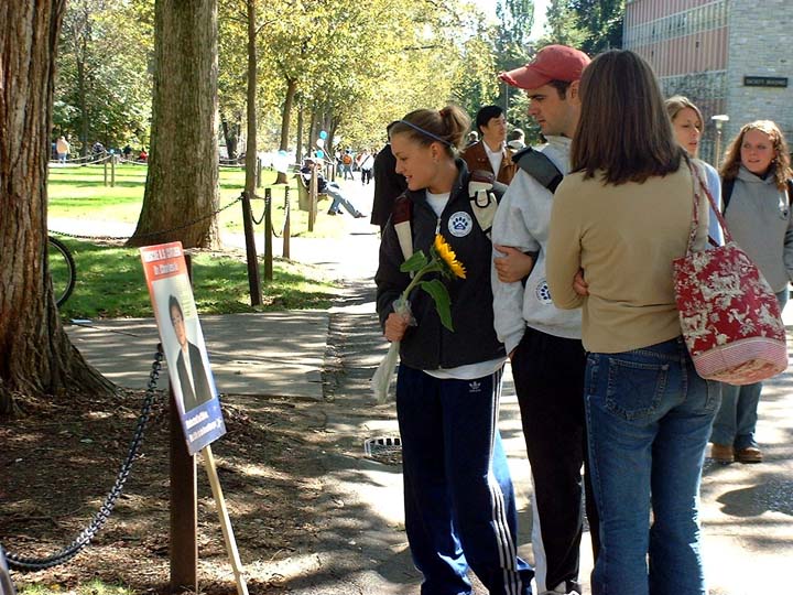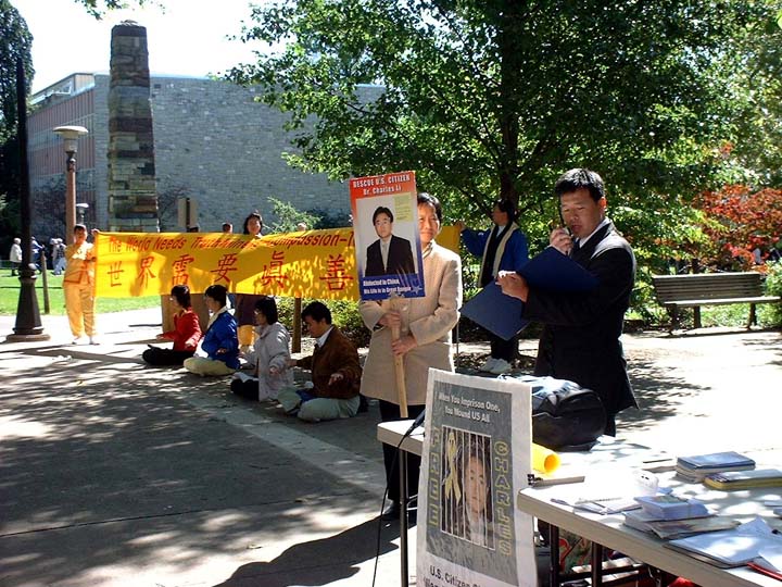 | 陈刚答谢宾州州立大学为营救包括他在内的被迫害亲人的签名活动 | 学生观看营救美国公民李祥春医生的展板 |