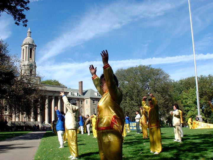 | 来往学生纷纷接过法轮功真相材料 | 法轮功学员在宾州州立大学校园炼功 |