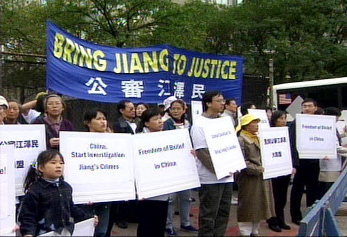 明慧网2003年10月9日报导摘录─「全球公审江××大联盟」10月6日移师纽约,在联合国广场前举行集会游行,并向联合国提交审江公开信。近三百名大联盟成员手中高举「把江××送上审判台」、「中国开始追查江××」、「停止迫害宗教信仰」、「呼唤中国人权」、「审判邪恶之首匡扶正义良心」的横幅和标语