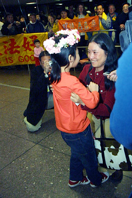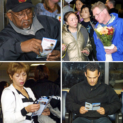 | 广州服装设计师李明,三年前因躲避迫害只身逃离中国来到纽约 | 2003年11月8日豆豆终于从大陆飞到纽约与母亲团圆 | 机场的其他旅客在了解法轮功 |