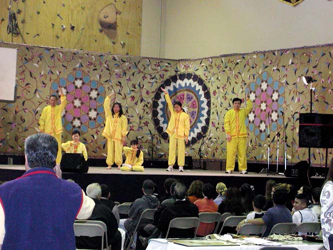 周六的上午,法轮功学员在舞台上演示舒展、优美的法轮功五套功法。另外为了使这次活动成功,向更多的人们展示大法的美好,由法轮功学员组成的舞蹈队还特意根据大法弟子创作的音乐“天地行”编排了一段新的舞蹈。“天地行”时而悠扬舒缓,似一股股清流在人间流淌,时而有起伏跌荡,展示大法在人间洪传的壮观景象。在下午的演出中,舞台上身著亮丽中国传统服装的学员,翩翩起舞,轻挥彩带,吸引了全场的目光,最后以两个学员举起“法轮大法好”的横幅,一位学员手托莲花的造型使整个舞蹈达到高潮。