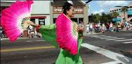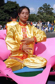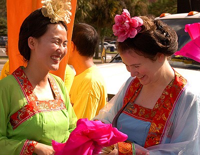 花车准备来自中国的安妮-李,和正在此短暂访问的来自Tampa的劳拉-海登,是这次参加佛罗里达大学返校节的法轮功花车中的30名学员中的两位。她们身着中国传统服装。
