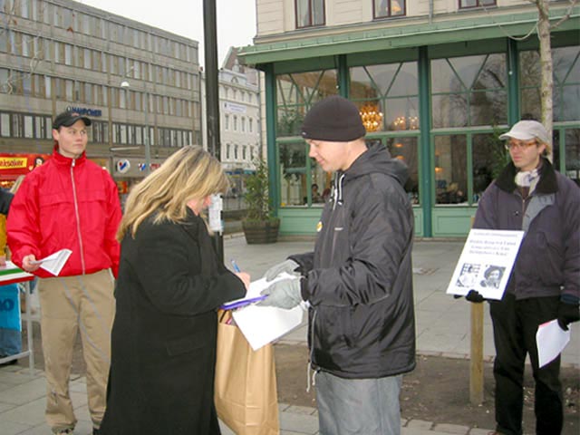 ,声援近百名被关押在吉林监狱绝食的法轮功学员,要求立即释所有被非法关押的法轮功修炼者,并呼吁社会大众关注此事,给予紧急援助。2003年11月15日,哥德堡的大法弟子又一次来到市中心的繁华地带,向过往行人征签,呼吁帮助营救大陆法轮功学员。路人们被江氏集团所采用的残酷手段所震惊,手拿签名簿的大法弟子身边常常围着一群人在听真象,走了一群又围过来一群。当天很多瑞典人在“支持对江罗一伙的起诉”等呼吁书上签名。