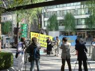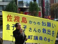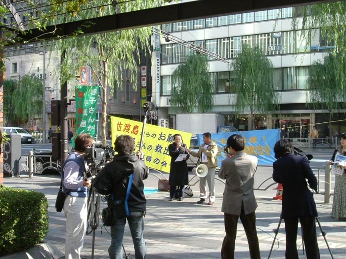 初冬的冷风中,好几面救援的横幅分外醒目,高音喇叭不断播放容子被中国无理关押近一年半的事件,呼吁全日本国民关注和帮助营救。