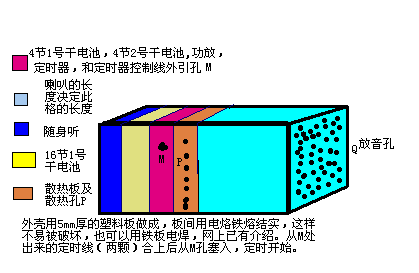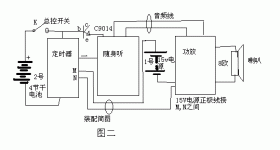 R2=2R1,计算公式T(s)=2.3nR1(欧)Cx(法),为方便计算化简如下:定R1为150k,Cx为变量。图九中A、B取负,n=4096,T(min)=23.55×Cx;A、B取正时,n=32768,T(hour)=3.14×Cx;A取正、B取负,n=128,T(min)=0.74×Cx;A取负、B取正,n=512,T(min)=2.94×Cx 。原理:CD4541是计数定时器,设定Cx后,电源接通开始计数,到设定时间后,从8脚输出脉冲信号,使C9013导通,继电器与随身听开始工作,继电器导通使功放通电,喇叭工作。注意:此处定时电路与随声听采用同一电源供电,因此用一个C9014接入,起降压作用,即中间脚与D相通,发射极连随声听正极,K为控制开关。第8脚不宜用C9014,其过流不如C9013大,随身听工作时电流在0.2-0.6A之间。悬挂条幅时,自己将D、C连接,电源用8节7号电池串联,在C9013体部拴上尼龙绳,到时C9013烧断尼龙绳,条幅脱落。C9013还可以点燃引线,使爆竹炸开箱子散发传单,吸引注意。