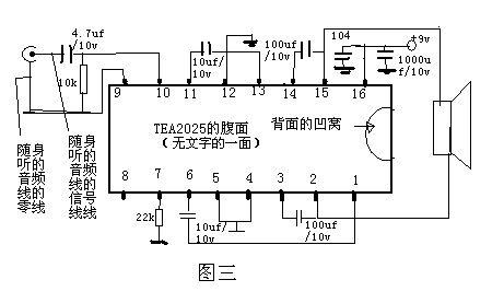⑴TEA2025,2元一块,电路图如图三。电源用6节1号干电池,为市场上25瓦喊话器的功放集成块。此处组成BTL电路,负载4欧时输出功率达到8瓦,适合在长途车等封闭环境使用。操作时,可将电阻电容直接焊在集成块上,然后在集成块背面涂上导热硅脂。固定在一小块铝片上,导热用。可与TEA2025直接替换的有LA4182、4183;SL4182;TDA4190、4550等。