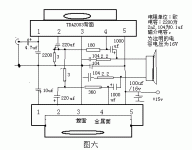 附3,TDA7381A是一种高保真优选功放,电路图如图五。负载8欧时不失真输出功达到100瓦(25瓦×4ch),外围元件少,可用4个扬声器四方广播,电源用电池串联或电瓶,可用4节一号电池并联再串联成15V,如果能购买到TDA7381建议使用。TDA2003,3元一块,如图六。LA4440,10元一块,如图七。前者在10对一号干电池串联成15V时负载8欧时,输出功率达18瓦,后者则可达21瓦,此处介绍的都是BTL电路,而且性能较佳。