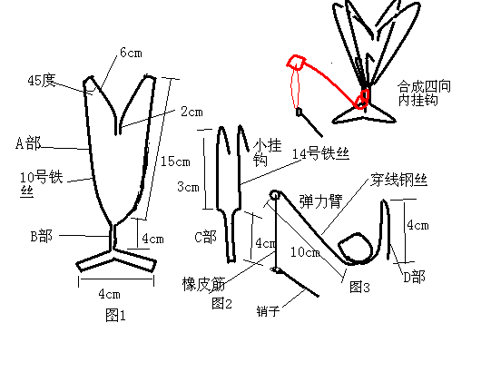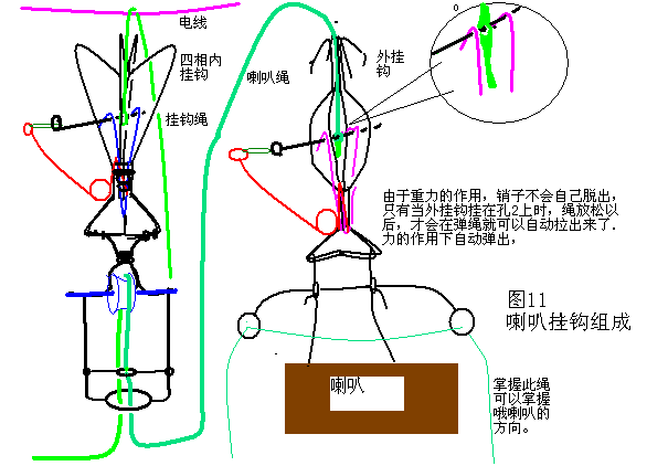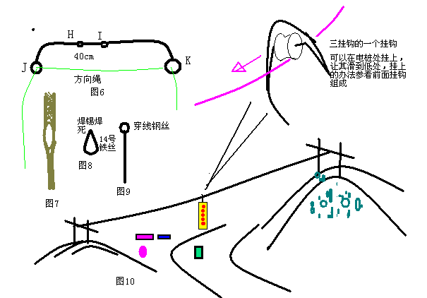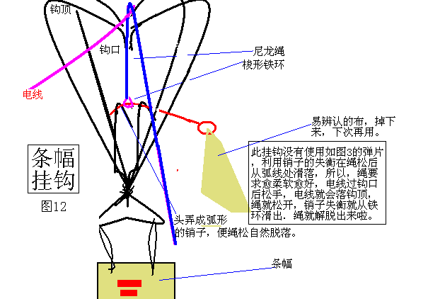 附1:做真相条幅直接取用四向内挂钩即可,销子改为弧形,(如条幅挂钩图)挂钩可以大大缩小,用穿线钢丝即可。为了不易取下,在一些高原地区的两山头之间往往有极高的高压线,若线下有公路,村庄,集市,可以在高压线的电桩处悬挂。此时的挂钩要改进,只用三向内挂钩,如图10,在每一个挂钩的顶部置一滑轮,从而将条幅滑向高压线的最低处,定时展开巨型条幅,定时只需3-4元。(前面已有介绍)。还可以在条幅中间裹上传单或小册子,这样展开同时可以使观众了解真相,但要考虑会否下雨或掉入水中。为了吸引群众,还可以定时放鞭炮,空中鞭炮响,引线末端系在固定条幅的小绳上,引线烧断小绳,条幅落下来,满天撒传单。在人多地方,效果较佳。