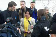 一出机场出口,容子就伸出双手忘情地快步握上欢迎人群的手,终于与妻子重逢的金子笃志连连说:太高兴了!见到容子的面我才真正放心了。蜂拥而至的中日文电视台、电台、报纸记者,将容子团团围住提问。容子表示,她非常感谢日本政府、日本驻华大使馆、各界人士关心、帮助,感谢救援会的各位,感谢全世界法轮大法同修们,感谢家人们的关心,谢谢丈夫的不懈努力,使得她终于脱离那个巨大精神压力的地方,回到自由安全的日本。她说:在失去自由的一年半中,也让我真正坚定自己对法轮大法“真、善、忍”的信仰。