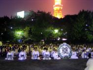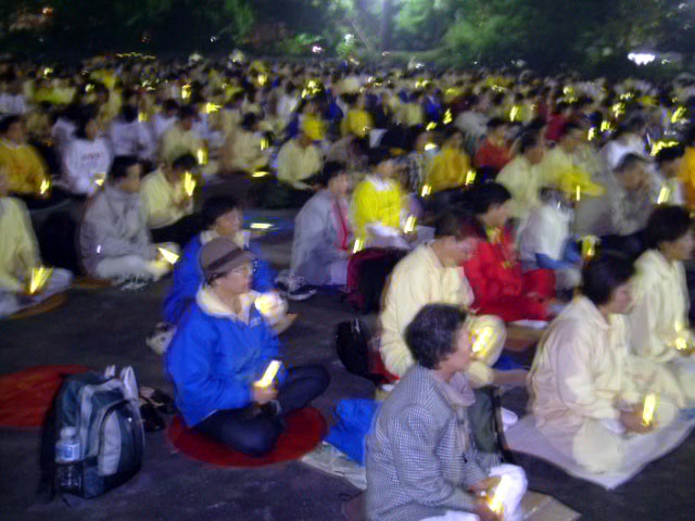 晚上在东京塔下举行了纪念被迫害致死的大陆同修的烛光追悼会。来自各国的学员代表作了简短发言,表达了对同修的怀念,表示为把江氏集团送上良心和道义的审判台将继续广泛而深入的讲清真象。