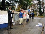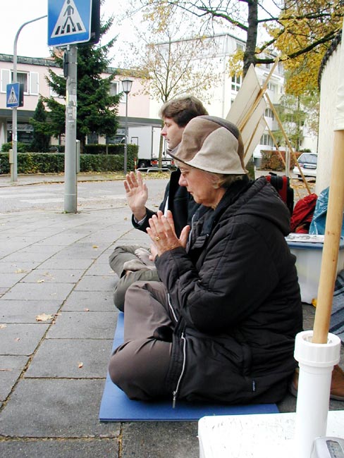 【明慧网2003年11月3日】为了促使中国政府停止法轮功、为了挽救吉林监狱绝食的大法弟子的生命,慕尼黑大法弟子续10月30日的抗议活动后,于11月1日再次来到中领馆前表达心声:强烈要求立即释放吉林监狱被关押的大法弟子,停止一切对法轮功的迫害。同时,再次向德国社会和民众传达我们的呼吁,希望大家都来关注江氏集团对法轮功的残酷迫害,早日结束这场人类的巨大灾难。