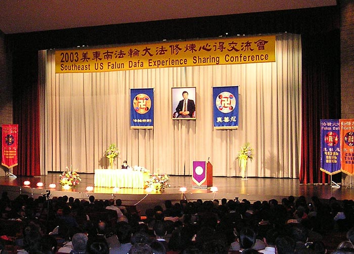 【明慧网2003年11月30日】11月29日,主要来自北美的千余名法轮大法弟子汇聚亚特兰大世界议会中心(World Congress Center),参加2003年美东南法轮大法修炼心得交流会。下午2点40分,在弟子们热烈的掌声中,尊敬的师父亲临会场,给弟子们讲法解法。讲法中,师父再一次强调了讲清真相的重要性,并告诉弟子们讲清真相的主要目的是救度众生。