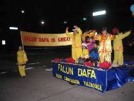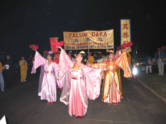 法轮功队伍是几十个花灯队伍中唯一的具有东方特色的游行队伍。优美的莲花舞伴着吸引了许多路边的观众。“真、善、忍”和“节日快乐”的彩旗表达了学员对当地群众的节日问候。一个彩灯点缀的花车和车上向观众展示功法的学员也是这只队伍的焦点。