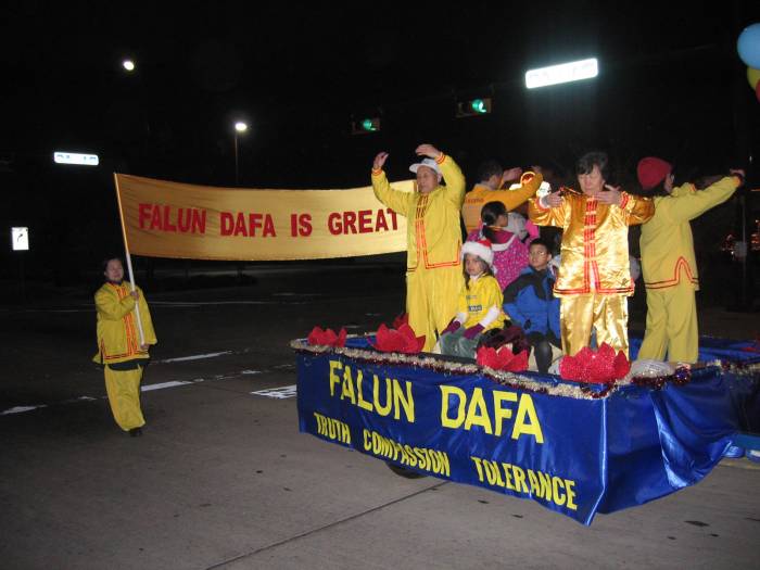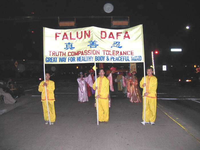 【明慧网2003年12月10日讯】又到了一年一度的假日季节。德州达拉斯市的法轮功学员在一个月前就申请参加阿灵顿市(City of Arlington, Texas) 的圣诞花灯游行并顺利得到批准。德州达拉斯市的法轮功学员和当地学员在阿灵顿市曾多次举办了法轮功学习班和各种形式的弘法活动,并得到阿灵顿市政府的多次褒奖。12月6日晚,达福地区的法轮功学员又齐聚阿灵顿市,向当地民众展示法轮功学员的风彩和大法的美好。