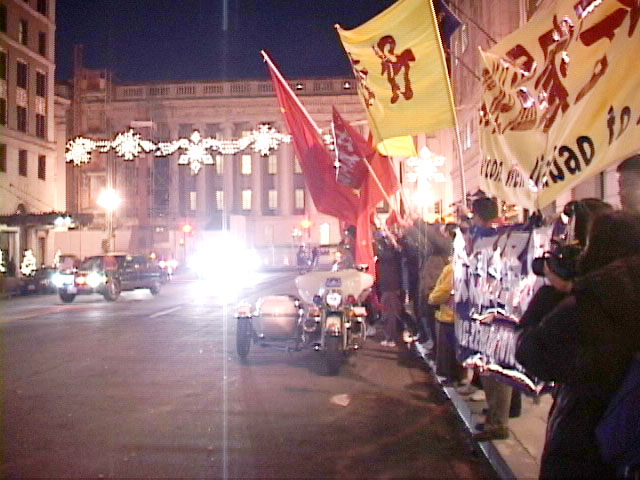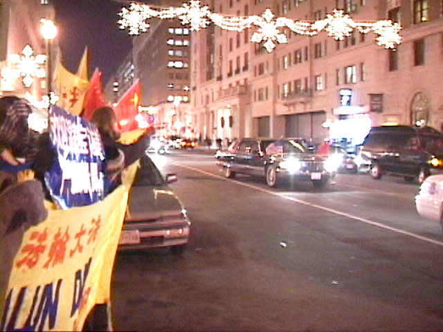 在今日全天的活动中,温家宝的车队几次从法轮功学员打出的“欢迎温家宝访美”、“严惩江泽民”、“法轮大法好”等横幅面前经过。