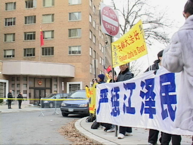 一位使馆安排来欢迎的女士问来自亚特兰大的法轮功学员陈志先生:为什么不通过其它途径,而在这么大影响的场合打“欢迎温家宝访美”、“严惩江泽民”、“法轮大法好”的横幅。陈说:“许多人不了解整个过程,97、98年时,一些地方对法轮功学员的无故骚扰明显增多,许多法轮功学员写信向各级政府部门反映情况,但石沉大海,只得亲自到各级政府部门上访,又经历了一些事情,最后才到国家的最高信访机构——国务院信访办公室上访。99年7.20镇压开始,最后的上访途径也没了。”
