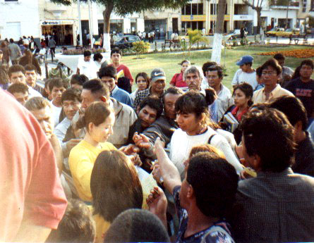 法轮功学员走在齐克拉约(CHICLAYO)的街上,人们看到时都会兴冲冲喊一声:法轮大法。有的行人停下脚步索取传单。的士司机看到法轮功学员会按一下喇叭并伸出大拇指。
