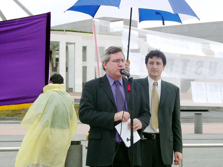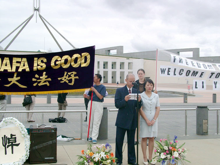 | 法轮功学员国会山集会 | 安德鲁-巴特利特参议员到现场发表演说 | 历经两年劳教冤狱,刚刚被营救来澳的法轮功学员李迎女士与澳洲未婚夫李麒忠 |