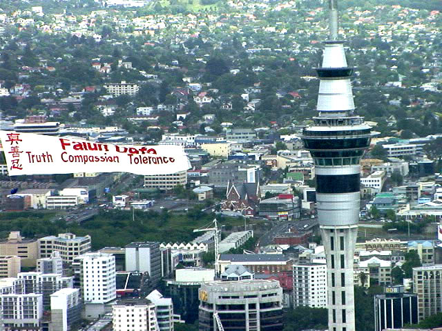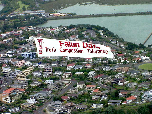 【明慧网2003年12月2日讯】11月30日,在新西兰奥克兰一年一度圣诞游行之际,大法弟子将一宽10米、长30米的巨幅旗帜由飞机拖曳着展示在半空中,上书中英文“真善忍”和“法轮大法”,历时一个多小时,蔚为壮观。