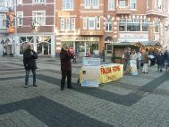 这天尽管天气寒冷,我们还是给许多行人发了资料。这次的活动是在一个特别宽敞的场地上举行的,旁边是一个在前一天刚刚开市的圣诞市场,环境很好。在市政厅的努力下,我们得到了这块有利的场地,他们祝我们的活动成功。与我们相邻的是小吃摊,很多游客经过此地,有的在我们展位前转了好几次,这也给了我们更多的向他们讲真相的机会。