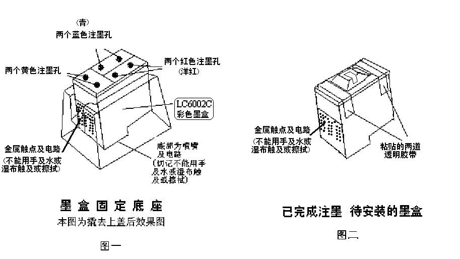 注意千万不要用手及其他物体碰到触点及喷嘴(墨盒底部的中间部分)。不能用纸碰到喷嘴。同时注墨时不要用任何东西粘住触点与底部喷嘴。墨盒静置后用窄透明胶带将上盖与墨体粘两道(见图二)。