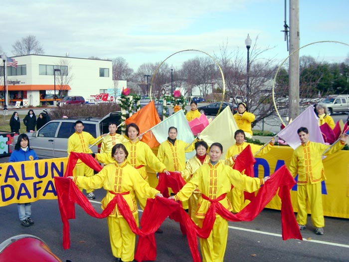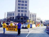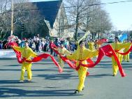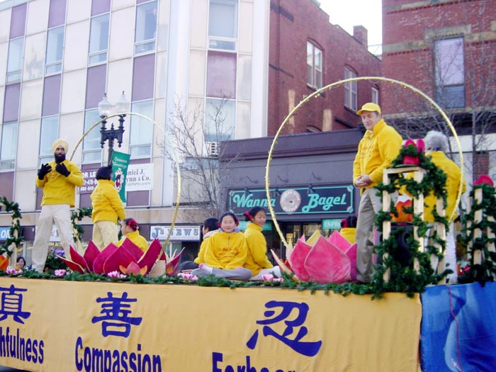 我们的游行队列由一个美好而庄严、以莲花为主题的彩车及两个舞蹈队组成。游行中,旗子舞首先登场,从武术动作排出的彩旗旋动配以学员编辑的音乐,男学员展示了他们的正直和威严。同时,女学员以彩绸舞表现了优雅和美好。游行中,明慧学校的学生在大莲花上演示了法轮功第五套功法,而不同种族的学员站在彩车四角演示动功。他们宁静、微笑的脸庞散发出了真诚、善良的信息。我们的彩车展示的纯洁、善良,及平和正好恰如其分地反映了今年游行的主题:“让地球上有和平”。